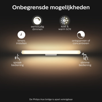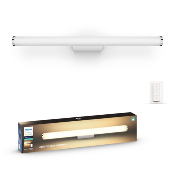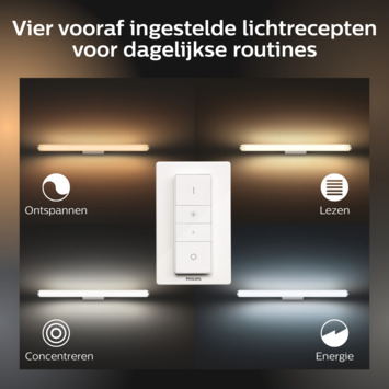 Placez cette applique murale étanche grand modèle Philips Hue Adore White ambiance au-dessus ou à côté du miroir de votre salle de bains et donnez à la pièce l'éclairage d'ambiance ou d'accentuation adéquat. Avec le variateur sans fil fourni, vous pouvez régler la lumière exactement comme vous le souhaitez. Vous pouvez aussi choisir la facilité avec les recettes lumineuses préconfigurées qui vous aideront dans chaque activité: réveil tonique avec une lumière blanche vive ou détente bienvenue après une journée chargée avec une lumière blanche chaude et confortable. Vous pouvez choisir entre 4 configurations lumineuses: "Tonus", "Concentration", "Lecture" ou "Détente".