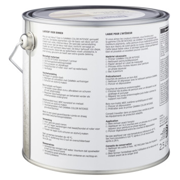 GAMMA Color Intense est un concept de couleur pour la peinture intérieure de haute qualité et d'une force de couleur profonde. Cette peinture intérieure intense couleur GAMMA haute brillance 2,5 L RAL 9001 est une peinture à base d'eau. La peinture à base d'eau est le meilleur choix pour l'intérieur. Il est inodore et conserve sa couleur plus longtemps. Cette peinture convient au bois et, en combinaison avec l'apprêt approprié, également au métal et aux plastiques. En utilisant les meilleurs pigments de cette peinture, vous conservez la force de la couleur profonde et intense. La peinture à base d'eau coule très bien et a une très bonne couverture.Pour un résultat optimal de cette peinture d'intérieur GAMMA Color Intens, traitez d'abord la surface avec l'apprêt GAMMA Color Intens. Le bidon a une capacité de 2,5 litres, ce qui est suffisant pour une surface d'environ 25 m². Trois heures après l'application de la peinture, elle est déjà sèche, après 24 heures, vous pouvez appliquer la couche suivante. Traitez la peinture à des températures comprises entre 8 et 25 ° C. La peinture peut être utilisée comme finition pour de nouvelles pièces non traitées, mais aussi sur des peintures existantes ou pour donner un nouveau look à des meubles. La peinture intérieure est facile à appliquer avec un pinceau ou un rouleau à peinture pour la peinture à base d'eau. Vous pouvez les acheter au GAMMA le plus proche ou via la boutique en ligne.Nous avons les 20 couleurs les plus tendances disponibles prêtes pour vous. Aussi bien en peinture murale qu'en laque. Si la couleur que vous recherchez n'est pas répertoriée, il est toujours possible de faire mélanger votre couleur spécialement par notre conseiller peinture. Ainsi vous créez toujours l'ambiance de vie qui vous ressemble : romantique, industrielle, sereine ou très colorée, tout est possible. Bref, cette peinture est un excellent choix pour donner un nouveau look à votre intérieur.