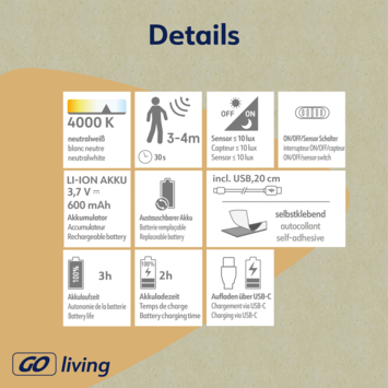 Le Mobina Push 15 est luminaire noir sous-meuble signé Müller-light, idéal, par exemple, sous vos armoires de cuisine. La lampe sans fil est dotée d'une source de lumière LED intégrée de 1,5 watts qui fournit une lumière blanche neutre avec une puissance lumineuse de 100 lumens. L'installation est facile grâce à la bande autocollante. Vous pouvez allumer et éteindre le luminaire grâce au grand interrupteur. Sur le côté de la lampe se trouve un autre interrupteur qui permet de régler le temps d'extinction automatique : 3 ou 15 minutes. Mobina Push 30 est rechargeable via le câble USB fourni. Complètement chargée, la lampe peut brûler jusqu'à 3 heures. Le temps de charge est également de 3 heures. Grâce au détecteur de mouvement intégré, la lampe s'allume rapidement, sans nécessairement devoir utiliser l'interrupteur.