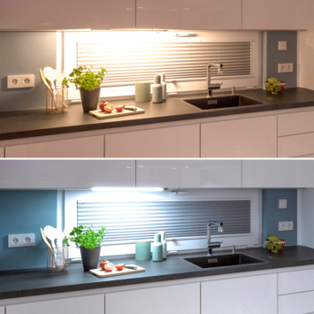 Le luminaire sous meuble Olus Sensor 50 LED assure des conditions d'éclairage optimales et un confort d'éclairage maximal dans la cuisine. Grâce au détecteur de mouvement intégré, la lumière peut être facilement allumée et éteinte d'un simple mouvement de la main. Grâce au capteur tactile de l'Olus Sensor, vous pouvez varier entre la lumière indirecte (3000 K) et la lumière directe (4000 K) ou combiner les deux couleurs de lumière. L'éclairage indirect offre une lumière d'ambiance très agréable, tandis que l'éclairage direct apporte une lumière vive sur le plan de travail, par exemple pendant la cuisson. Le Olus Sensor dispose également d'un capteur de mouvement avec fonction de gradation, de sorte que vous pouvez régler la lumière à la luminosité souhaitée en passant simplement votre main sous le capteur. La fonction mémoire, qui stocke le dernier réglage sélectionné, offre également encore plus de confort.