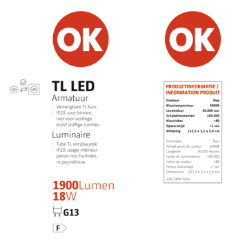 Ce luminaire fluorescent LED T8 OK 18 W est une lampe fluorescente pour votre maison. La lampe a une durée de vie de 25 000 heures et durera donc des années. Parce qu'il s'agit d'une lampe à économie d'énergie, vous protégez l'environnement et réduisez les coûts. Par exemple, illuminez le garage avec la lumière vive du luminaire fluorescent OK LED 18 W qui diffuse une lumière blanche froide. Culot G13, luminosité 1800 lumens.