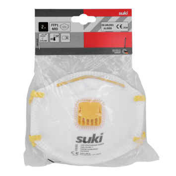 Le masque de protection FFP1 de suki vous protège lors de vos travaux contre l'inhalation de substances inoffensives. FFP1 est la classe de protection du masque. FFP1 signifie que le masque protège jusqu'à 4 fois la valeur MAC. Vous utilisez le masque de sécurité de suki par exemple lorsque vous êtes exposé à des particules fines, à des brumes ou à de la fumée. Le masque empêche l'inhalation de telles substances et offre en outre un grand confort de port grâce à la valve d'expiration. Cela vous permet de poursuivre vos travaux sans entrave. Le masque de sécurité FFP1 de suki est vendu par lot de 2 pièces. GAMMA propose également des masques de sécurité avec d'autres classes de protection dans sa gamme. Par exemple, des masques avec la classe de protection FFP2 ou FFP3.