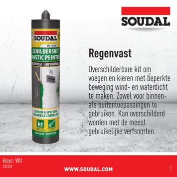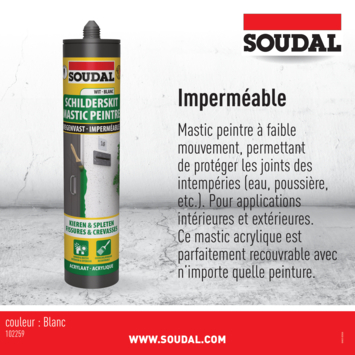 Ce mastic acrylique Soudal à faible mouvement est idéal pour protéger efficacement les joints contre les intempéries telles que l’eau, la poussière ou l’air. Conçu pour un usage intérieur et extérieur, il convient parfaitement aux applications autour des portes, fenêtres, fissures et interstices.