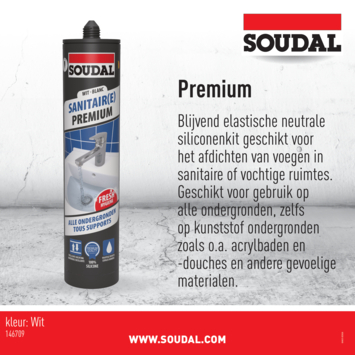 Le mastic sanitaire Soudal Premium blanc 290 ml est un mastic silicone sans acide à élasticité permanente. Ce produit convient pour sceller les joints et les zones sanitaires et humides, comme une douche, une baignoire, des murs (carrelés), un lavabo et entre les sols et les toilettes.