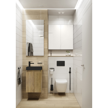 Optez pour plusieurs finitions élégantes : un meuble blanc classique ou l’aspect chaleureux du chêne naturel ou foncé avec un lavabo en céramique blanc ou noir. Le lavabo peut être monté à gauche ou à droite pour s’adapter parfaitement à votre espace.