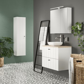 Design rustique avec une touche de modernité. Le meuble sous-vasque Tiger Maryport 80 cm en blanc mat avec plan droit haut effet bois chêne clair donne un aspect luxueux, élégant et propre à votre salle de bains. Ce meuble sous-vasque est entièrement assemblé et dispose de 2 grands tiroirs qui permettent de ranger tous vos produits de beauté. Les trous pré-percés à mi-profondeur pour les poignées noires mates permettent une installation facile. Le lavabo en céramique, arrondi, brillant en blanc parfait son style. Ce lavabo est hygiénique, résistant aux rayures, aux produits chimiques et ne nécessite pratiquement aucun entretien. Chez Tiger, nous apprécions les matériaux durables et grâce à la gestion responsable des forêts, nous contribuons à un avenir plus vert. Maryport est fabriquée dans des matériaux durables. Il est aussi fait pour durer. Cherchez-vous plus d'accessoires dans un style rustique? Pour un style parfait, combinez cet ensemble avec un miroir, une armoire miroir ou un grand placard de la collection de meubles Tiger Maryport.