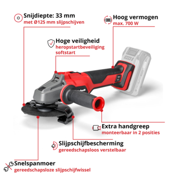La meuleuse d’angle sans fil Axxio 18/125 Q Einhell est un outil très utile pour effectuer des travaux à l'atelier, à la maison ou au garage. Puissance, absence de fil et confort : des caractéristiques prioritaires tout au long de la conception de l’outil. La meuleuse d’angle fait partie de la gamme Power X-Change au sein de laquelle toutes les batteries sont compatibles avec tous les appareils. Elle atteint une performance optimale avec des batteries 2,5 Ah ou supérieures issues de cette gamme. Le moteur sans charbon offre davantage de puissance et une durée de fonctionnement plus longue. Grâce à son moteur puissant, la meuleuse d'angle sans fil fournit la même puissance qu'un outil filaire équivalent de 700 W. La fonction de démarrage progressif et le dispositif anti-redémarrage assurent une meilleure sécurité de l’utilisateur. Le design compact avec revêtement souple Softgrip ergonomique et la poignée auxiliaire permettent une utilisation confortable. Grâce au désaccouplement du moteur et de l’engrenage, le fonctionnement est très silencieux. Le capot de protection à réglage rapide permet une utilisation flexible. La poignée auxiliaire peut être fixée dans deux positions pour plus de flexibilité. Grâce à l’écrou à fixation rapide, plus besoin de clé à ergots pour remplacer le disque de coupe : le changement de disque s'effectue rapidement et sans outil. La meuleuse d’angle sans fil est équipée d’une protection contre les surcharges. Le carter d’engrenage robuste en aluminium a été conçu pour garantir une grande longévité. L’outil est vendu sans batterie ni chargeur. Le disque de coupe adapté (diamètre 125 mm) est lui aussi disponible séparément.