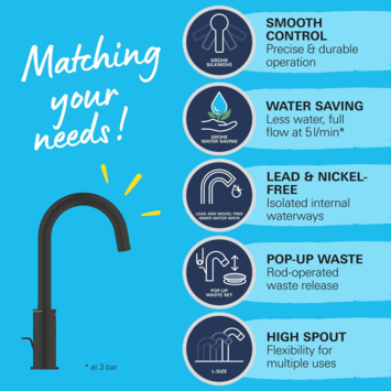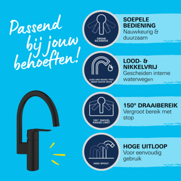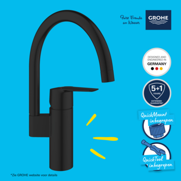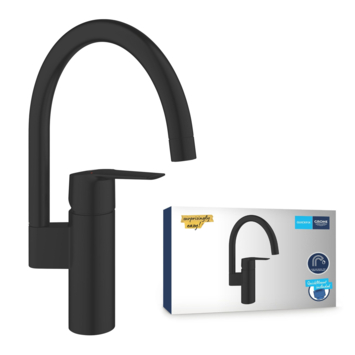 Ajoutez le robinet de cuisine Grohe Start avec bec en C haut au design de votre cuisine et profitez d'un confort supplémentaire ! Ce best-seller QuickFix est un véritable classique du design avec un profil fin et contemporain et un bec haut qui pivote en douceur de 150° pour plus de flexibilité. La cartouche Grohe SilkMove offre un contrôle doux et précis du volume et de la température de l'eau tout au long de la vie du robinet. Avec ce robinet de cuisine, vous profiterez d'une eau potable délicieuse ! En effet, Grohe Zero garantit que l'eau du robinet ne peut pas entrer en contact avec le plomb et le nickel. équipé d'un limiteur de débit réglable, votre consommation d'eau sera réduite et grâce au limiteur de température intégré, vous économiserez sur vos coûts d'énergie chaque mois. La finition durable Grohe Long-Life est facile à nettoyer, ce qui vous permet de profiter d'un robinet de cuisine noir mat sans égratignure qui reste magnifique. Conçu pour une installation en un seul trou et avec l'aide du QuickGuide, de la QuickVideo et du système Grohe QuickMount sans outil, vous installerez ce robinet en un rien de temps. Une pression minimale de 0,2 bar est recommandée pour le mitigeur de cuisine Grohe Start.