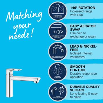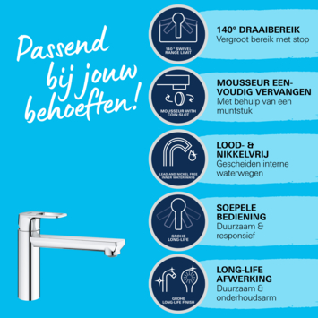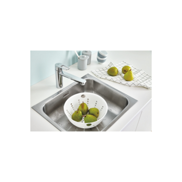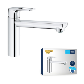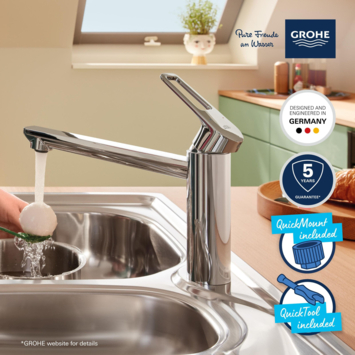 Le robinet de cuisine GroheStart Loop M rend vos tâches de cuisine plus amusantes et plus faciles ! Le mitigeur de cuisine est doté d'un bec de hauteur moyenne qui pivote de 140° en douceur. Désormais, le rinçage des grandes casseroles et le remplissage des carafes d'eau ne seront plus un problème. La cartouche céramique Grohe Long-Life assure un réglage en douceur du volume et de la température de l'eau via la poignée en boucle. Le mousseur se dévisse facilement à l'aide d'une pièce de monnaie, ce qui est très pratique lors du remplacement ou du grand nettoyage de la cuisine. Grâce aux circuits d'eau internes sans plomb ni nickel, l'eau débitée ne peut pas entrer en contact avec le plomb ni le nickel. L'eau courante a donc un goût agréable et frais. Le revêtement Long-Life Shine de Grohe garantit que le robinet de cuisine reste exempt de rayures et se nettoie facilement à l'aide d'un chiffon sec. Le robinet de cuisine GroheStart Loop s'installe via un assemblage à trou unique, et avec l'aide du QuickGuide, de la QuickVideo via un code QR et du système Grohe QuickMount, vous y parviendrez en un rien de temps. Une pression minimale de 1 bar est recommandée pour ce robinet.