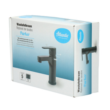 Le robinet pour lavabo Atlantic Parker noir est un mitigeur de 16,5 cm de hauteur et 14,1 cm de profondeur avec 2 flexibles de raccordement de 41 et 42 cm, matériel de fixation et instructions de montage. Ce robinet mitigeur permet de régler d’une seule main la température d’eau souhaitée. La fonction Eco-Clic intégrée permet d’économiser l’eau. Il s’agit d’un ressort intégré au levier, grâce auquel le robinet ne s’ouvre pas directement à la puissance de jet maximale. Pour obtenir un jet plus puissant, il suffit de pousser le levier plus loin. Grâce à l’Eco-Start, lorsque le levier est au centre, seule de l’eau froide s’écoule, contrairement aux mitigeurs standards où l’eau chaude s’écoule également dans la même situation. Au-delà d’économiser de l’eau grâce au dispositif Eco-clic, l’Eco-Start vous permet également de ne pas gaspiller d’eau chaude. Le robinet possède un système très pratique permettant de le fixer par le haut sur le lavabo. Le tartre, qui adhère difficilement à l’aérateur anticalcaire, s’élimine d’un simple geste de la main. La finition en noir mat donne à ce robinet droit aux formes épurées un look moderne et puissant. Nettoyez le robinet au chiffon doux et à l’eau claire. N’utilisez pas de produits d’entretien abrasifs, mordants, agressifs ou contenant du vinaigre. Ce robinet bénéficie de 5 ans de garantie.