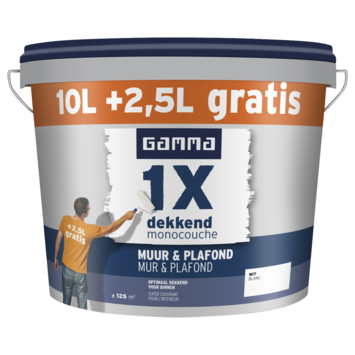 Monocouche mur & plafond GAMMA. Cette peinture monocouche est une peinture au latex mate à haut pouvoir couvrant pour les murs et plafonds des lieux secs à l’intérieur (séjour, chambre à coucher, hall d’entrée, etc.). Elle est respirante, offre une bonne lavabilité et est quasiment inodore. Suivant la couleur et la qualité du support, cette peinture couvre en une seule couche. Sur les murs qui n’ont pas encore été traités, il convient d’utiliser d’abord un primer pour obtenir un résultat optimal. Avec ce seau de 10+2,5 litres gratuits vous pouvez peindre environ 125 m².