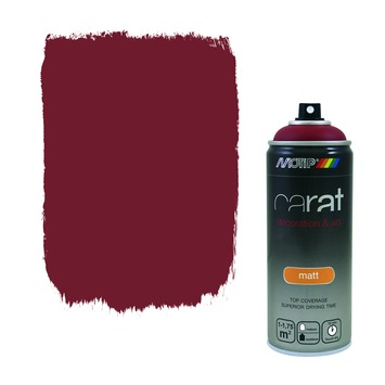 La laque Motip Carat est destinée à la décoration. Elle convient à des surfaces traitées et non traitées comme le bois, le métal, l'aluminium, le verre, la pierre, et divers types de plastique. Cette laque possède un excellent pouvoir couvrant ainsi qu'une couleur et un éclat durables. Elle résiste à l'usure, aux rayures, aux produits chimiques et aux intempéries. Disponible en différentes couleurs, dont ce mate Purple Red (400 ml).