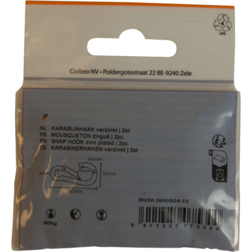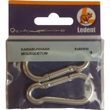 Rapidement besoin d’un point d’attache ? Pensez au mousqueton en métal zingué de 60 mm. Ce mousqueton est fabriqué en métal zingué, résistant à la rouille. Il a donc une plus grande longévité. Ce mousqueton est prévu pour un usage intérieur et possède un doigt sur charnière, qui permet de l’ouvrir et le fermer simplement. Cet article est emballé par deux pièces. Bref, le mousqueton est simple, rapide et efficace.