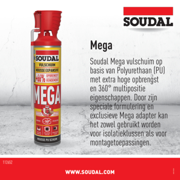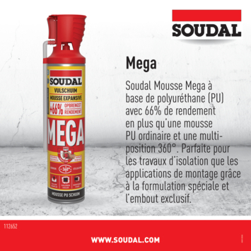 Soudal méga mousse PU 600 ml est une mousse PU universellement utilisable que vous pouvez utiliser pour installer rapidement et fermement les cadres de fenêtres et de portes. Cette mousse ne se dilate pas pendant le processus de durcissement, de sorte que les cadres installés ne sont pas expulsés. En plus des travaux d'assemblage, vous pouvez également utiliser ce produit comme mousse isolante pour divers matériaux. Il a 66% de rendement en plus par rapport aux mousses PU standard. Grâce au système « Genius Gun », ce produit dispose d'une poignée pratique avec laquelle vous pouvez facilement pulvériser la mousse PU. Avec le système de fermeture, cela peut être parfaitement fermé, de sorte que vous pouvez l'utiliser jusqu'à 6 semaines après la première utilisation. En bref : une mousse PU facile et multifonctions.