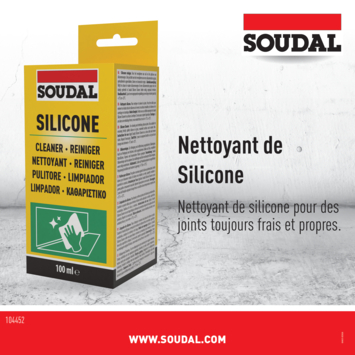 Soudal propose non seulement des mastics d’étanchéisation pour tous les types de travaux mais aussi tous les outils pour les utiliser efficacement. Utilisez Soudal Nettoyant de silicone pour nettoyer les joints sales ou pour enlever les restes ou taches fraîches de silicone.