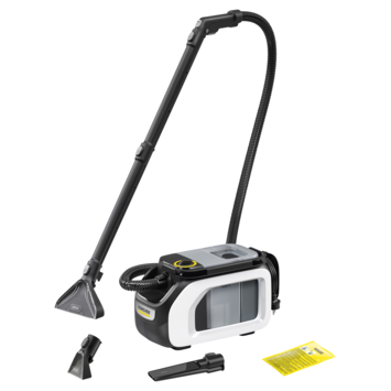 - En kit complet : Le kit comprend le Kärcher SE 3 Compact, un suceur plat pour tissus d’ameublement, un suceur plat et 100 ml de détergent RM 519.