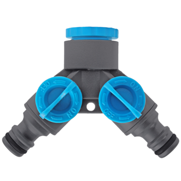 Avec ce nez de robinet GAMMA en 2 parties, vous pouvez facilement connecter deux tuyaux d'arrosage à votre robinet. C'est idéal, par exemple, si vous souhaitez utiliser deux types de buses différents. De plus, le robinet est équipé de boutons rotatifs afin que vous puissiez régler l'alimentation en eau pour chaque tuyau séparément. Cette pièce de robinet convient aux robinets d'eau avec un filetage de 3/4'' (26,5 mm) ou 1'' (33,3 mm). Couleur : gris avec du bleu.