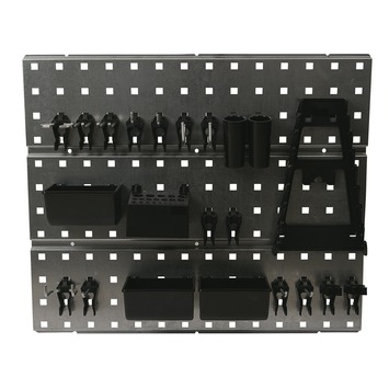 2 panneaux muraux perforés en acier Raaco de 520x440x11 mm avec un assortiment de 22 clips et crochets pour ranger tous types d’outils. Clips supplémentaires disponibles séparément. Matériau : acier.