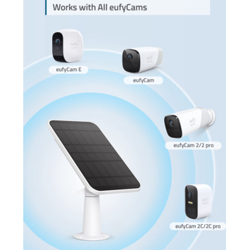 Ce panneau solaire fonctionne avec toutes les EufyCam telles que l'eufyCam E, l'eufyCam 2, l'eufyCam 2 Pro, l'eufyCam 2C ou l'eufyCam 2C Pro. Vous utilisez le panneau solaire uniquement en combinaison avec des produits Eufy, non compatible avec d'autres marques.