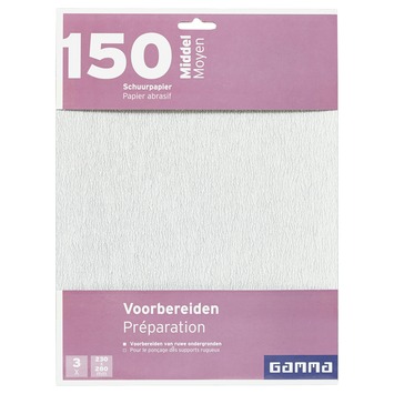 Le papier abrasif mi-brut avec taille de grain 150 de GAMMA convient pour les travaux de ponçage mi-bruts comme le ponçage de différentes couches de peinture ou de laque sur le bois, le métal ou le plastique. Tuyau : vous pouvez tenir le papier à poncer en main ou le fixer à un appareil prévu à cet effet. Ce set contient 3 feuilles de ponçage avec une dimension de 23 sur 28 centimètres. Disponible en différentes tailles de grain abrasif.