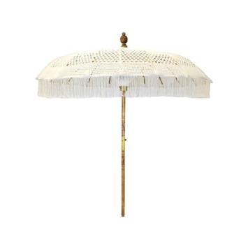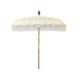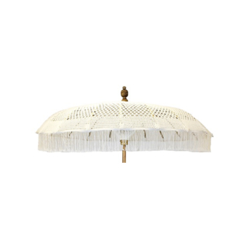 Parasol Bali blanc en macramé. Le parasol mesure 185 cm de diamètre et 245 cm de haut. Le parasol est pliable.