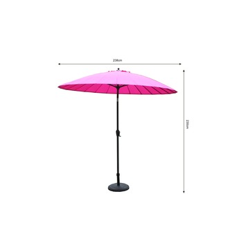 Le parasol Shangai de couleur fuchsia est un parasol de jardin qui affiche une allure d’inspiration asiatique. Une touche d'exotisme, une touche de mystère ? Le parasol robuste en forme de bâton rond a été composé à partir d'une combinaison intelligente de métal, de matière synthétique et de polyester afin d’offrir une belle résistance au soleil et lors d'une pluie fine. Bon à savoir : le parasol Shangai est doté d’un mécanisme de pliage avec poignée, un mécanisme d'inclinaison et il est disponible en différentes couleurs.