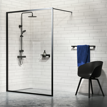 La douche à l'italienne A3 Contour Black 98x200cm a un cadre minimaliste qui est fini en noir mat. La paroi de douche a un verre de sécurité de 6 mm d'épaisseur et est dotée d'une couche anti-calcaire. Grâce à cette couche, le verre reste magnifiquement clair plus longtemps. La douche à l'italienne est placée avec un support stabilisateur de 1 mètre. Le support peut être raccourci à la longueur souhaitée et peut également être monté dans un coin. En conséquence, la douche à l'italienne A3 Contour Black 98x200cm s'intègre dans presque toutes les salles de bain.