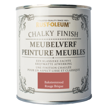 La peinture à finition chaulée pour meubles Rust-Oleum de Chalky Finish (750 ml) de couleur rouge brique est la peinture parfaite pour donner une nouvelle jeunesse à vos meubles, anciens ou nouveaux. Cette peinture peut être directement appliquée sur le bois, la brique, la pierre, le plâtre ou toute autre surface dure prétraitée. Disponible en différentes couleurs. Astuce : pour un résultat optimal, appliquez une couche protectrice de cire ou de vernis pour meubles par-dessus la couche de Rust-Oleum Chalky Finish.