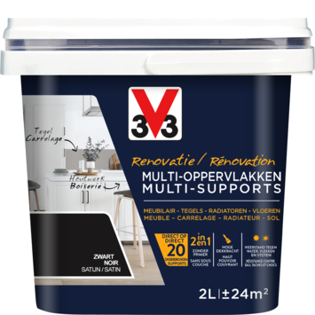Avec la peinture de rénovation multi-surface V33 noire en seau de 2 litres, vous rénovez rapidement divers objets dans la maison. Cette peinture de rénovation est spécialement conçue pour la rénovation de presque toutes les surfaces. Vous utilisez la peinture à l'intérieur sur des meubles, des sols et des carreaux, et elle adhère directement sur des surfaces non absorbantes et des couches de peinture existantes. Un apprêt ou un décapant n'est pas nécessaire, ce qui vous permet de commencer rapidement.
