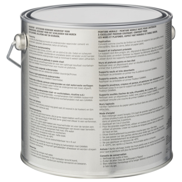 La peinture murale GAMMA pour intérieur convient pour les murs et les plafonds. La peinture murale mate GAMMA granit 2,5 L à base aqueuse n’a quasiment pas d’odeur. Le pot, d’une contenance de 2,5 litres, permet de couvrir environ 20 m². La peinture est déjà sèche hors poussière deux heures après son application; la couche suivante peut s’appliquer après un délai de 6 heures. La température idéale de mise en œuvre de cette peinture est comprise entre 8 et 25°C.