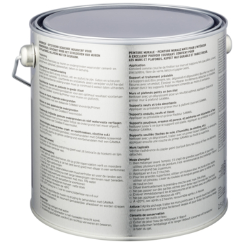 Pour des résultats optimaux, nous vous recommandons de traiter d'abord la surface avec le Primer GAMMA. Si la surface est fortement contaminée (par exemple taches de suie et d'humidité, nicotine), nettoyez d'abord la surface avec un dégraissant et prétraitez avec l'agent isolant GAMMA. Il y a 20 belles couleurs toutes faites disponibles dans le magasin GAMMA près de chez vous. Et les conseillers en peinture peuvent mélanger n’importe quelle autre couleur pour vous. Avec la peinture murale GAMMA, vous pouvez rapidement donner un tout nouveau look à votre intérieur.