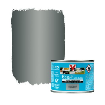 La peinture pour l'extérieur Easy Colours de V33 est votre alliée idéale pour la décoration ou la rénovation de tous types de surfaces à l'extérieur, comme vos meubles de jardin, barrières, etc. Cette peinture brillante de couleur aluminium métallique (125 ml) adhère à toutes les surfaces, comme des métaux (oxydés), cuivre, fer, aluminium, PVC et bois. Cerise sur le gâteau : Easy Colours est facile à appliquer, ce qui vous évite le décapage et le ponçage. Cette peinture résiste même à l'eau, aux taches, aux rayures, aux chocs, et aux intempéries. Disponible en d'autres couleurs.