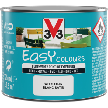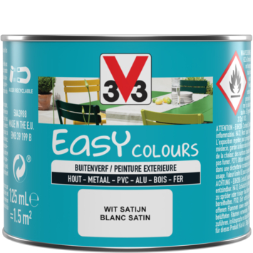 La peinture pour l'extérieur Easy Colours de V33 est votre alliée idéale pour la décoration ou la rénovation de tous types de surfaces à l'extérieur, comme vos meubles de jardin, barrières, etc. Cette peinture satinée de couleur blanc satin (125 ml) adhère à toutes les surfaces, comme des métaux (oxydés), cuivre, fer, aluminium, PVC et bois. Cerise sur le gâteau : Easy Colours est facile à appliquer, ce qui vous évite le décapage et le ponçage. Cette peinture résiste même à l'eau, aux taches, aux rayures, aux chocs, et aux intempéries. Disponible en d'autres couleurs.