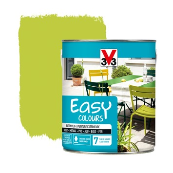 La peinture pour l'extérieur Easy Colours de V33 est votre alliée idéale pour la décoration ou la rénovation de tous types de surfaces à l'extérieur, comme vos meubles de jardin, barrières, etc. Cette peinture satinée de couleur 'vert absinthe' (2,5 l) adhère à toutes les surfaces, comme des métaux (oxydés), cuivre, fer, aluminium, PVC et bois. Cerise sur le gâteau : Easy Colours est facile à appliquer, ce qui vous évite le décapage et le ponçage. Cette peinture résiste même à l'eau, aux taches, aux rayures, aux chocs, et aux intempéries. Disponible en d'autres couleurs.