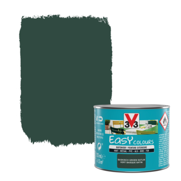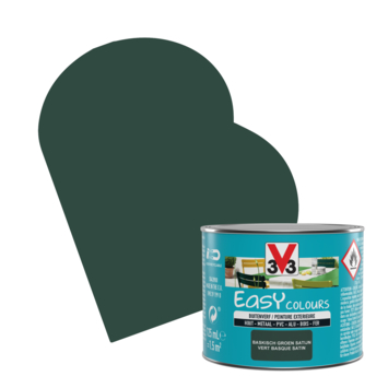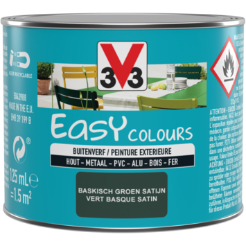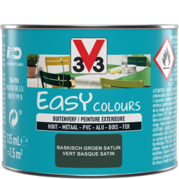 La peinture pour l'extérieur Easy Colours de V33 est votre alliée idéale pour la décoration ou la rénovation de tous types de surfaces à l'extérieur, comme vos meubles de jardin, barrières, etc. Cette peinture satinée de couleur 'vert basque' (125 ml) adhère à toutes les surfaces, comme des métaux (oxydés), cuivre, fer, aluminium, PVC et bois. Cerise sur le gâteau : Easy Colours est facile à appliquer, ce qui vous évite le décapage et le ponçage. Cette peinture résiste même à l'eau, aux taches, aux rayures, aux chocs, et aux intempéries. Disponible en d'autres couleurs.