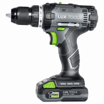 Le kit perceuse sans fil LUX contient une batterie LUX 20V / 2Ah, un chargeur de batterie 20V et la perceuse sans fil LUX. Cette perceuse a un couple maximum de 35 Nm, ce qui rend la machine adaptée à tous les travaux de vissage et de perçage. Pour les travaux plus lourds, nous recommandons le marteau perforateur LUX.