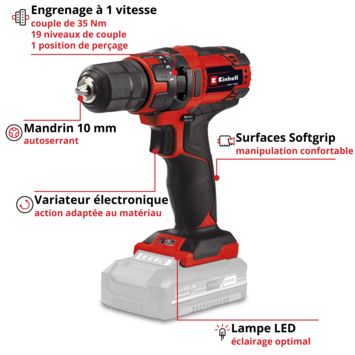 La perceuse-visseuse sans fil Einhell TC-CD 18/35 Li - Solo est un outil très maniable de la gamme Power X-Change. Les avantages de l’outil sans fil sont évidents : avec la nouvelle génération d’appareils sans fil puissants et résistants Einhell, plus de risques de trébuchement ni de câbles entravant la liberté de mouvement. Le design ergonomique et le revêtement souple Softgrip offrent une maniabilité parfaite et une prise en main ferme et sûre. Le variateur électronique à 21 niveaux assure un travail adapté au besoin et au matériau à traiter. La perceuse-visseuse est équipée d’un foret de 10 mm à double manchon. L’éclairage LED offre une visibilité parfaite sur l’espace de travail et un travail optimal dans les environnements sombres. La batterie et le chargeur sont disponibles séparément, notamment dans le Starter Kit, très pratique. Les batteries aux cellules lithium-ion haute performance sont compatibles avec tous les appareils de la gamme Power X-Change.