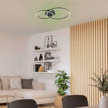 Ce plafonnier Palmaves 3 CCT/RVB-LED en métal noir comporte deux éléments lumineux ronds de tailles différentes. Les LED intégrées derrière les capuchons en plastique blanc peuvent facilement être réglées d'une lumière blanche fonctionnelle à une agréable lumière blanc chaud à l'aide de la télécommande incluse. Vous pouvez également dimmer ce plafonnier ou le mettre sur une minuterie via cette télécommande. De plus, l'arrière est équipé de LED RVB. Cela vous permet de créer la télécommande votre propre rétroéclairage d'ambiance. De design minimaliste, ce plafonnier apporte un éclairage moderne dans n'importe quelle pièce, qu'il s'agisse d'une chambre, d'un couloir, d'une salle à manger, d'une cuisine ou d'un salon.