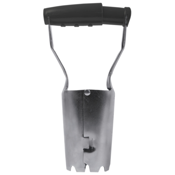 Ce plantoir à bulbes GAMMA est bien pratique : sur le côté, une graduation vous permet de connaître à quelle profondeur vous l'enfoncez dans le sol. La poignée est en plastique, le plantoir en acier galvanisé. Nettoyez-le à l'eau puis enduisez-le légèrement d'huile ou de téflon pour le protéger.