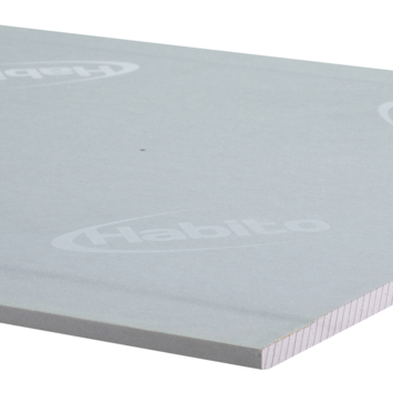 De Gyproc Habito wandplaat is een zeer stevige hard geperste (en dus wel wat zwaardere) gipsplaat waarbij in principe geen houten platen nodig zijn als ondergrond. Toch hebben wij ervoor gekozen om dat wel te doen en dan ontstaat (incl isolatie achter de houten wand) een wand die absoluut tegen een stootje kan en waar je nog eens iets aan kunt hangen zonder kunst en vliegwerk. Als je er tegenaan klopt klinkt het als een massieve wand. We hebben de Habito platen enkele jaren geleden ontdekt en nemen geen andere meer.