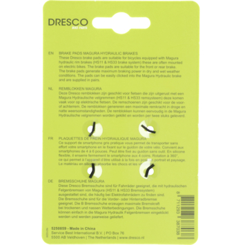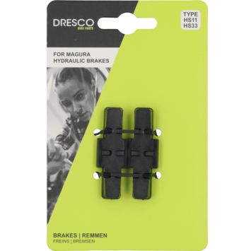Ces plaquettes de frein Dresco conviennent aux vélos équipés de freins hydrauliques Magura sur la jante (système de freinage HS11 & HS33) et souvent montés sur des vélos électriques. Conviennent au frein avant ou arrière. Les plaquettes de frein génèrent une puissance de freinage maximale par temps sec et humide. Elles peuvent être facilement clipsées sur le frein hydraulique. Livrées par paire.