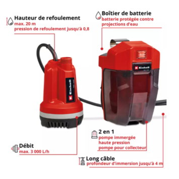 La pompe immergée et pompe pour collecteur d’eau de pluie sans fil GE-PP 18 RB Li est un outil puissant de la gamme Power X-Change, équipée de batteries lithium-ion haute performance. Conçue pour diverses applications, cette pompe flexible peut être utilisée de deux manières :