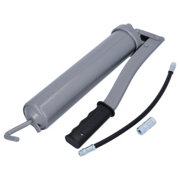 Cette pompe à graisse est en acier et répond à la norme DIN 1283. La graisseuse est idéale pour des cartouches de 400 g ou 500 cm³ de graisse en vrac. Un tuyau blindé de 300 mm de long avec un embout hydraulique M10x1 mm permet d'atteindre des endroits difficiles d'accès. La graisse peut être dosée en étant expulsée à l'aide du levier.
