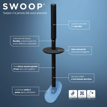 Une sensation de fraîcheur et de modernité dans les toilettes ou la salle de bain grâce à ce porte-balais de toilette bleu de Tiger Tess. Accrochez-le au mur ou posez-le. Collez-le ou montez-le avec des vis et des chevilles. Cela dépend entièrement de vous. Ce support est équipé de la nouvelle brosse WC flexible Swoop®. Avec cette tête de brosse innovante, vous pouvez facilement nettoyer les endroits difficiles d'accès et grâce à la forme et au matériau spécial de la brosse, il ne reste aucune saleté et elle ne coule pratiquement pas lorsque vous la remettez dans le support. Tiger Tess est innovant et contemporain avec la qualité reconnaissable de Tiger.