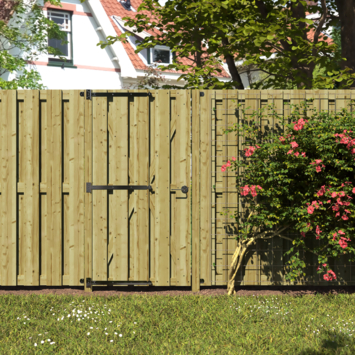 Ce portail s'adapte parfaitement à la l'écran Jumbo droit. Il complète votre clôture de jardin ! Il est conseillé de traiter le bois avec une lasure de jardin après 5 ans. La porte jardin est composée de 9 planches d'environ 13,5 cm de large et d'environ 1,3 cm d'épaisseur. Les planches sont fixées avec des vis. Le portail, tout comme la clôture, a une durée de vie d'environ 10 ans et une intimité moyenne. Le portail a une largeur standard d'environ 90 cm et une hauteur d'environ 180 cm. Cette porte jardin peut être installée à gauche ou à droite. Les matériaux de montage doivent être achetés séparément.