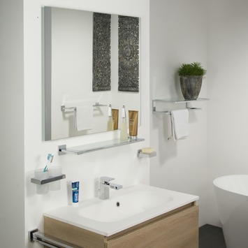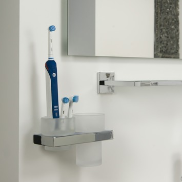 Items démontre qu'on peut faire plus avec moins. Les lignes épurées de ce concept moderne de salle de bains se retrouvent jusque dans les accessoires, comme ce porte-gobelet et brosse à dents où chrome brillant et verre mat se marient harmonieusement. Moderne, n'est-il pas ?