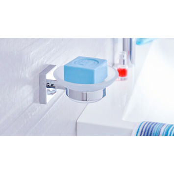 L'élégant porte-savon tesa® Ekkro se compose d'une combinaison de chrome brillant et de verre satiné. C'est un accessoire de salle de bain élégant et pratique. Le montage est très simple grâce à la technologie brevetée tesa® Power.Kit : 1) Collez l'adaptateur sur le mur et remplissez-le avec l'adhésif tesa® Power.Kit 2) Laissez ensuite l'adhésif durcir pendant 12 heures 3) Vissez le support sur le adaptateur et placez le porte-savon dans le support. Tous les matériaux nécessaires sont inclus dans l'emballage : support avec porte-savon et kit de fixation BK20. Le support est facile à retirer sans résidus de colle ni dommages. Il peut-être monté à nouveau avec un nouveau jeu d'adaptateurs BK20, qui peut également être acheté séparément. Convient pour les carreaux, le métal, la pierre naturelle, le marbre, le béton, le bois, le verre et de nombreux types de plastique. Ne convient pas aux papiers peints, stucs et autres surfaces avec un revêtement antiadhésif. Divers accessoires sanitaires sont disponibles dans cette série Ekkro, pour un look complet. Donnez un nouveau style à vos toilettes ou votre salle de bain avec Ekkro.