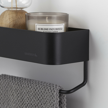 Le porte-serviette avec tablette n'est qu'un des accessoires de la série Brix de Sealskin. En métal noir, certains avec des détails de bois, ces accessoires raffinés et originaux s'associent aussi bien à une salle de bain plutôt industrielle qu'à la salle de bain plus intemporaire. Cette série est également disponible en blanc.