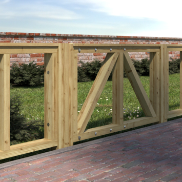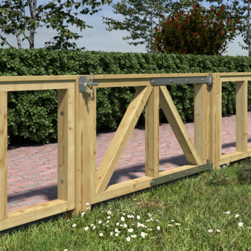 Le portail est facile à fixer entre 2 poteaux. Utilisez 2 pentures droites de 60 à 80 cm. Fixez les charnières à la barrière à l'aide d'un boulon de carrosserie et de vis en inox. Fixez les pouces (réglables) sur les poteaux à la même hauteur. La porte peut alors être facilement placée dans les pouces. Fixez ensuite un loquet à la porte et au poteau.