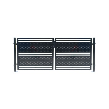 Le portillon Sicilia moderne vous permet de compléter votre clôture de façon pro. Faites votre choix entre un portillon simple ou double dans la couleur de vos rêves… Noir par exemple ? Ce portillon double de 300 cm de large (standard) et 150 cm de haut est fait de piliers, d'un cadre et de plaques perforées en aluminium durable, avec un revêtement noir. Plaques pour les pieds, charnières, clé et serrure comprises. Disponible en portillon simple de la même couleur ou anthracite.